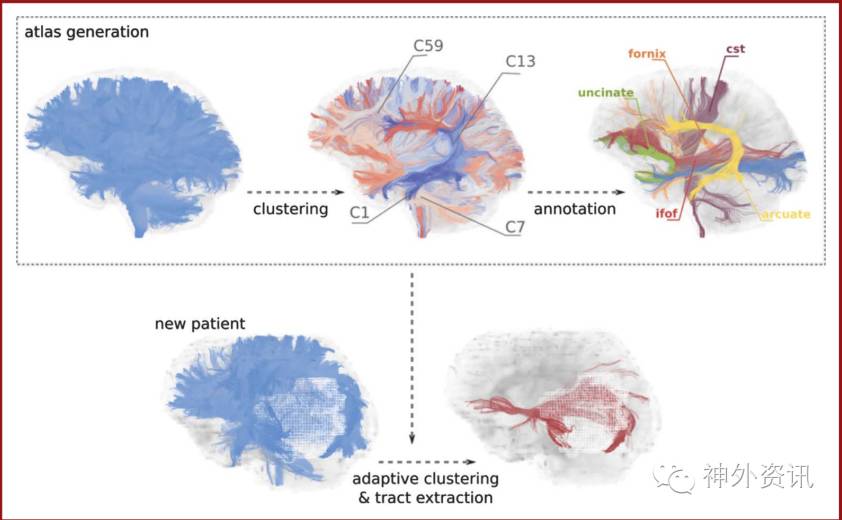 图1. 纤维束自动化识别步骤。白质纤维束图由健康参与者的纤维束聚类模型形成。利用同一个纤维束聚类模型图对不同肿瘤患者进行纤维束自动化匹配。