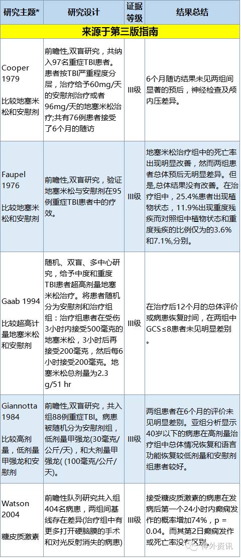 在本版研究中,有四个新的关于类固醇使用的研究报道。经审查后,其中三个被排除在外,因其并不符合本研究主题的入选标准(见附录F)。收录的研究为一项I级临床研究证据,是CRASH研究中的一项为期6个月的临床研究。早期CRASH研究中的使用类固醇2周后的结果在前版指南中被收录。除此之外,来源于前一版指南的两项II级临床研究和五项III级临床研究也同样被列入以下临床试验证据的表格中。