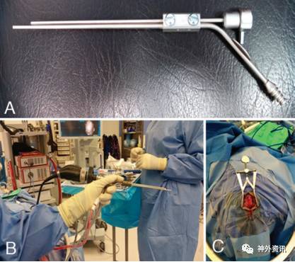 图1. 内镜装置和患者体位。A.安装吸引套管的内镜;B.术者左手持内镜;C.手术体位和冠状缝前中线处2-3cm的头皮切口。