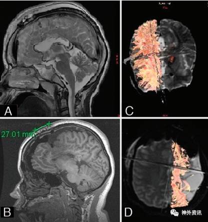 图4. 术后MRI和MRI-DTI。A.胼胝体切开术后MRI矢状位T2图像;B.大脑半球离断术后MRI矢状位T1图像;C.胼胝体切开术后MRI-DTI成像;D.大脑半球离断术后MRI-DTI成像。