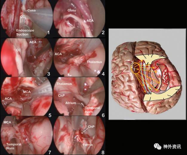 图3. 内镜辅助大脑半球离断术。图1-8为手术过程中照片,均按右图大脑切除区段的示意图进行;图1-3显示胼胝体前部切开;图4和图5显示前额离断;图6和图7显示脑侧面离断;图8示离断穹隆。ChP:脉络丛。