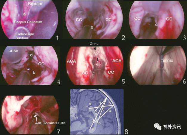 图2. 内镜下胼胝体切开术。图1-5所示的手术过程,按图8 MRI矢状位上示意的切口方向进行;图6和图7分别显示切开穹隆和前联合。CC:胼胝体。
