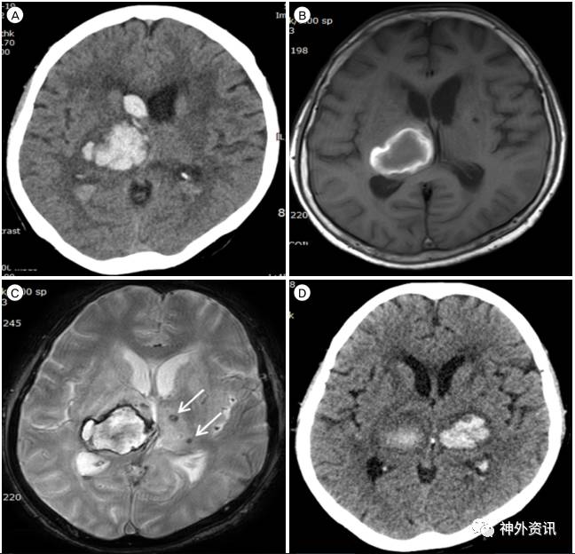 图1. A.初次发病时CT扫描示右侧丘脑出血破入脑室;B、C.起病后15天MRI显示右侧丘脑亚急性血肿伴左侧丘脑微出血灶(箭头);D.第17天CT显示左侧丘脑血肿。