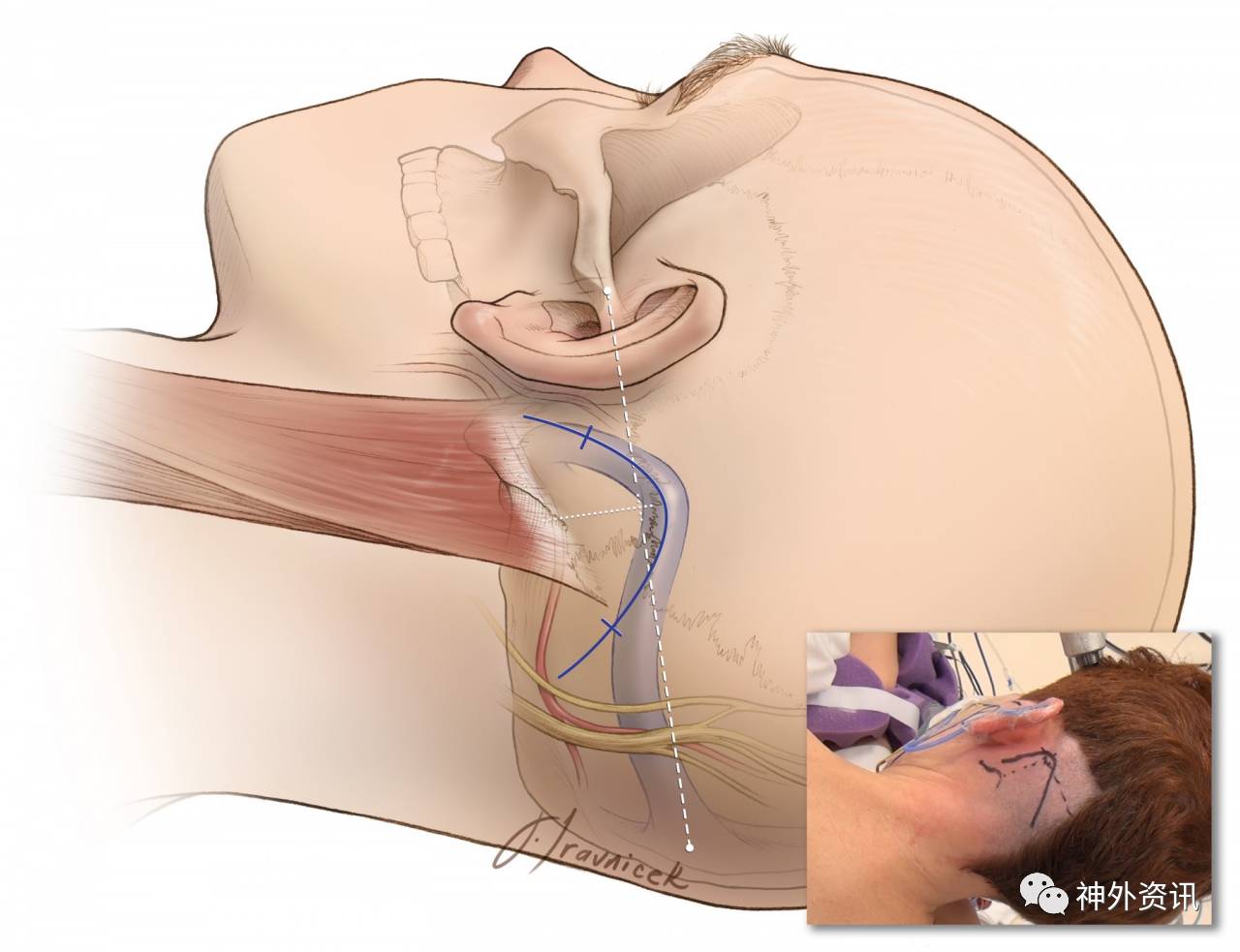 如前述,平行前庭蜗神经的外内方向牵拉小脑可能导致术后听力下降,因此,有上外侧和下外侧两种途径可以到达桥小脑角。