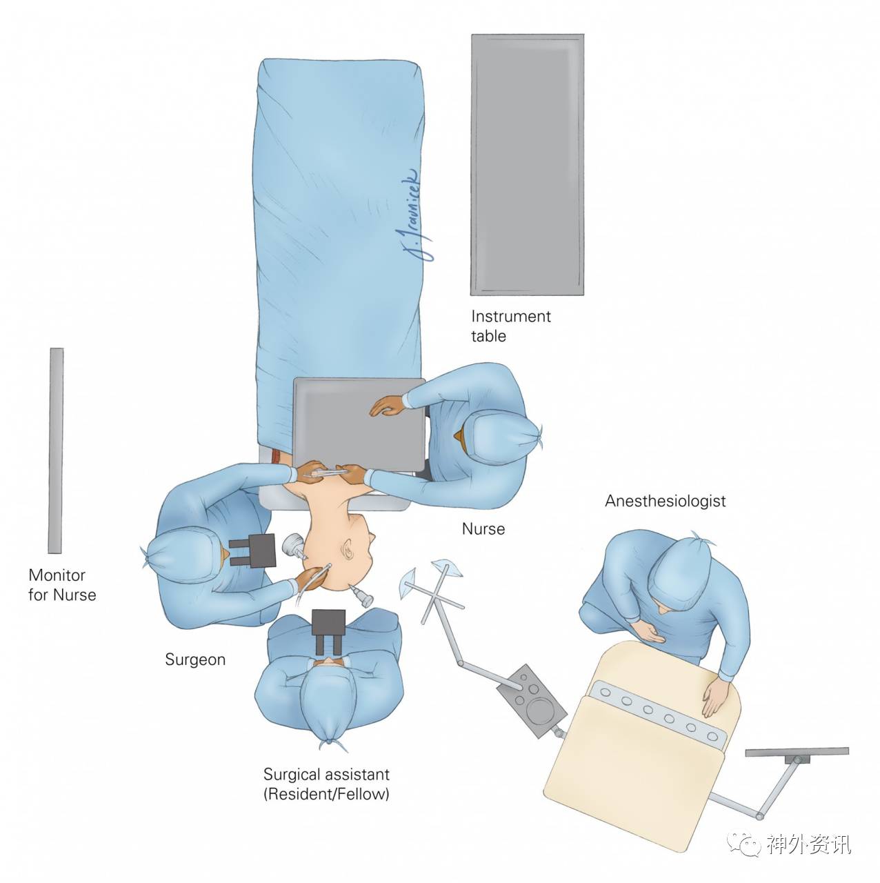 图3. 术者站着开颅,进行显微操作时则取坐位。洗手护士位于术者对面,以便于传递手术器械。麻醉医师站在患者足端以为助手及其他手术团队成员腾出更多空间。我本人习惯坐着进行显微操作,因此,在后颅窝手术时,患者的体位是侧卧位。