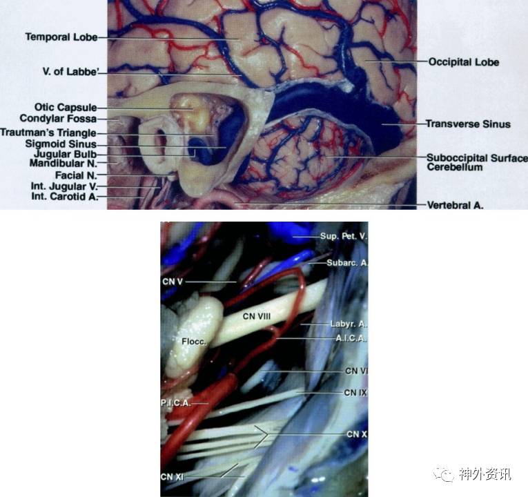 图2. 上图展示了乙状窦、横窦及两者与乳突尖等骨性结构的关系;下图为乙状窦后入路暴露桥小脑角的术野。三叉神经位于远离术者的术野深面,而面听神经束位置表浅,位于上手术通道的斜下方。