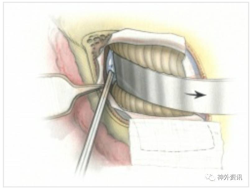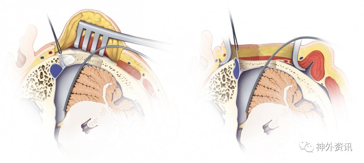 这种方法使得乙状窦可以随剪开的硬膜由缝线往前牵开,从而更好地从外侧暴露桥小脑角,同时小脑的牵拉反而减轻。