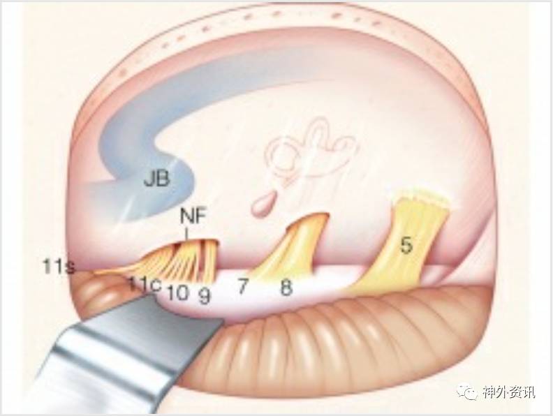 为了防止损伤前庭蜗神经,只能平行于三叉神经或者舌咽神经的方向牵拉小脑。锐性分离蛛网膜、吸引器动态牵拉小脑可降低颅神经损害风险。