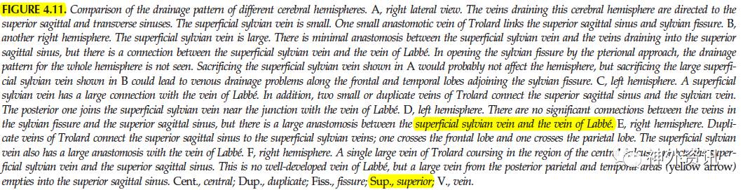 V. of Trolard = Trolard静脉(上吻合静脉); V. of Labbe’ = Labbe静脉(下吻合静脉);Mid. Temp. V. = 颞中静脉;Temp. Sylvian V. = 侧裂颞侧静脉; Sup. Sylvian V. = 侧裂浅静脉