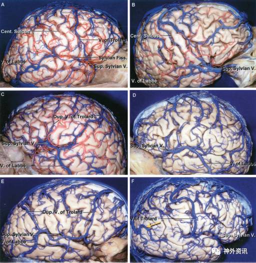 图4.11. 不同大脑半球静脉引流的模式。A. 右侧侧面观。引流大脑半球的静脉直接汇入上矢状窦和横窦。侧裂浅静脉(superficial sylvian vein)很小,一支很小的Trolard静脉将上矢状窦和侧裂静脉相连。B. 右侧大脑半球(另一标本)。侧裂浅静脉很大,在侧裂浅静脉和引流至上矢状窦的静脉之间只有很小的吻合支,而在侧裂浅静脉和Labbe静脉之间存在连接。此类病例,当采用翼点入路打开侧裂时,整个大脑半球的静脉引流模式不甚清楚。牺牲诸如图A中的侧裂浅静脉很可能不会影响到大脑半球的静脉引流,而牺牲诸如图B所示的较大的侧裂浅静脉,很可能导致汇集额侧和颞侧侧裂区域的静脉回流障碍;C. 左侧大脑半球。侧裂浅静脉和Labbe静脉之间存在主要的连接。除此之外,较小的双干Trolard静脉将上矢状窦与侧裂静脉相连。Trolard静脉的后支在临近Labbe静脉的结合部与侧裂浅静脉相连接。D. 左侧大脑半球。在侧裂区静脉和上矢状窦之间无明显的吻合支,但是,在侧裂浅静脉和Labbe静脉之间有一支很大的吻合支。E. 右侧大脑半球。双干Trolard静脉将侧裂浅静脉与上矢状窦相连接,一支跨过额叶,一支跨过顶叶。同时,侧裂浅静脉与Labbe静脉之间也存在很大的吻合支。F. 右侧大脑半球。位于中央沟区域的单支Trolard静脉将侧裂浅静脉与上矢状窦相连。未见发育良好的Labbe静脉,但在顶后和颞叶区域可见一支较大的静脉(黄色箭头)引流至上矢状窦。