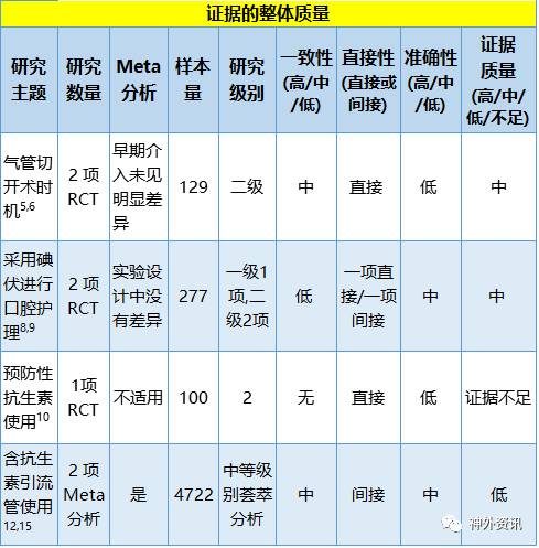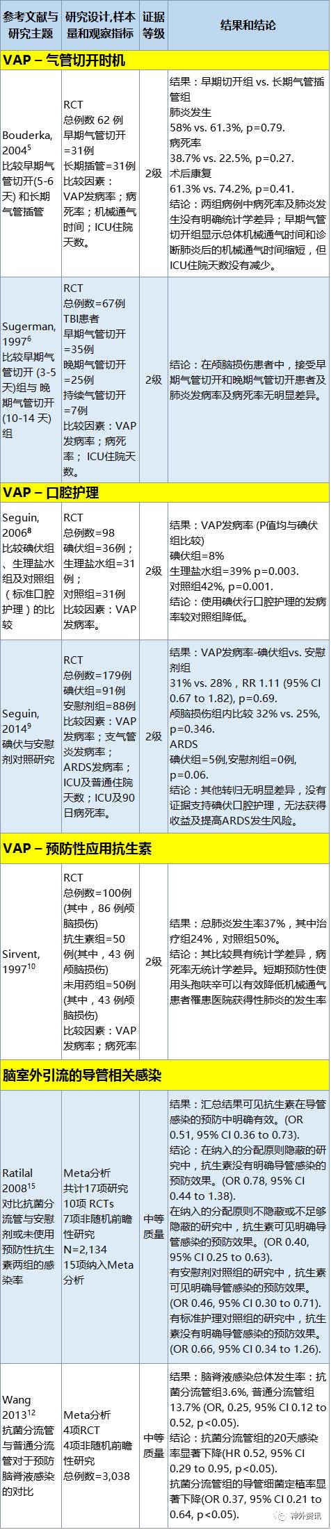 一级、二级研究证据中, 3种预防颅脑损伤患者VAP方法,2项针对早期气管切开[5,6],2项针对碘伏行口腔护理[8,9],1项针对短期预防性抗生素应用[10]。