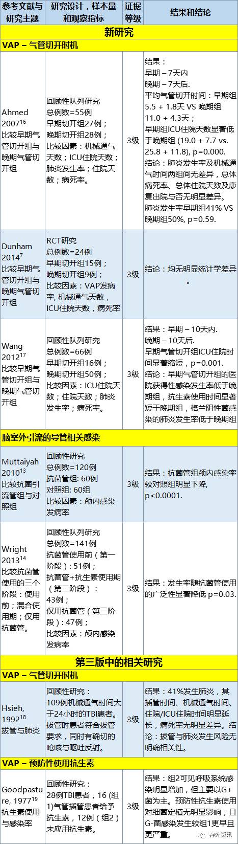 在第四版的指南中对于感染这一问题回答了两个问题。对于呼吸机相关肺炎预防的问题仍保持和第三版相同的态度, 原因在于颅脑外伤的呼吸机相关肺炎发病率没有显著高于较非颅脑外伤患者。 同时,对于脑室外引流相关感染的预防也保持和前一版相同的态度。由于获得了新的循证医学证据,因此对第三版中的推荐进行了修正。