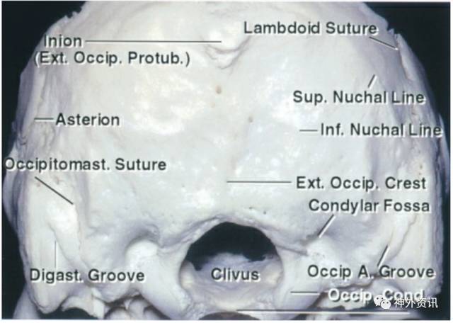 图1. 枕骨骨性标志。上项线和枕骨粗隆分别作为横窦和窦汇的体表标志。星点不是横窦和乙状窦硬脑膜连接处的可靠标志,在星点上钻孔经常落在横窦之上,有造成横窦出血的风险(该图片由AL Rhoton Jr提供)。