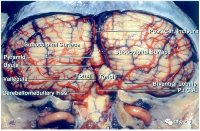 图2. 移除枕骨暴露相关硬脑膜窦,图片展示小脑的表面解剖结构(该图片由AL Rhoton Jr 提供)。