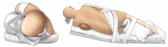 病人采取俯卧位、坐位或侧俯卧位。作者喜欢采用侧俯卧位,因为重力可以使手术视野更清晰,而且可以坐着完成显微操作部分。