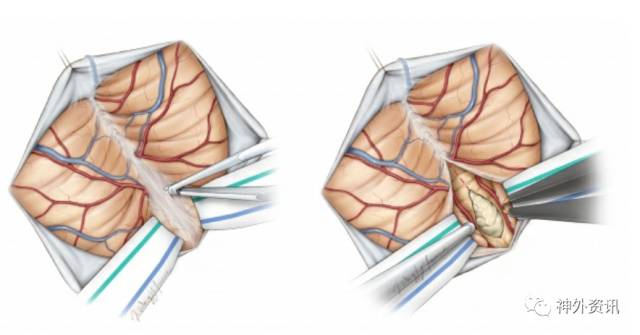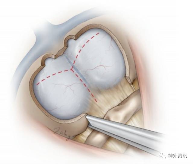 Y型剪开硬脑膜,切口尽量向下延伸以便将硬脑膜瓣更好的向两侧移动。硬膜上方切口延伸到横窦下方。中线部位的病变,硬膜可以沿着中线切开;这种方法可以使术后硬脑膜缝合的更加严密(该图根据Tew,van Loveren和 Keller的图片重新绘制 )。