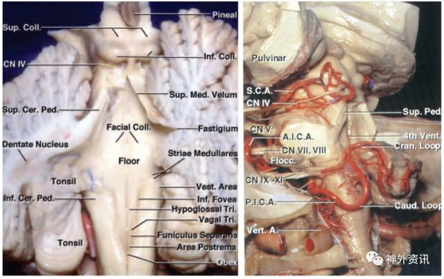 图4. 第四脑室底部功能解剖(左图)。移除小脑后展示小脑上动脉(SCA)、小脑下前动脉(AICA)和小脑下后动脉(PICA)的走行(右图----侧面观)(该图片由AL Rhoton Jr 提供)。