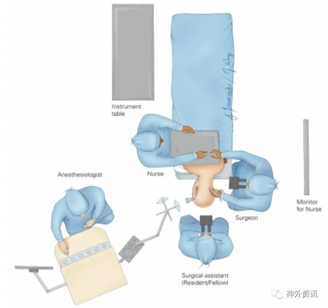 图5. 手术室布局说明。患者采用改良的侧俯卧位,器械护士站立于手术医生的对面从而更高效率的传递器械。麻醉医师可以位于手术床的末端。这种布局可以为其它操作团队提供额外的空间。