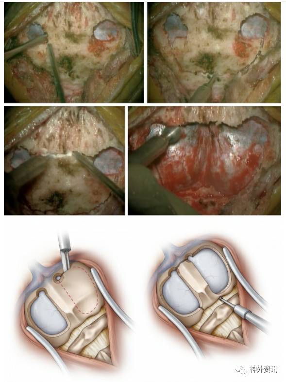 图9. 对于枕骨大孔区和上颈椎的损伤,为了更广泛的开放硬脑膜和充分暴露损伤区域,需要进行寰椎椎板切除术。通常沿着枕骨大孔移除骨瓣,可以提供一个更灵活的经膜髓帆入路到达第四脑室病变的通道。
