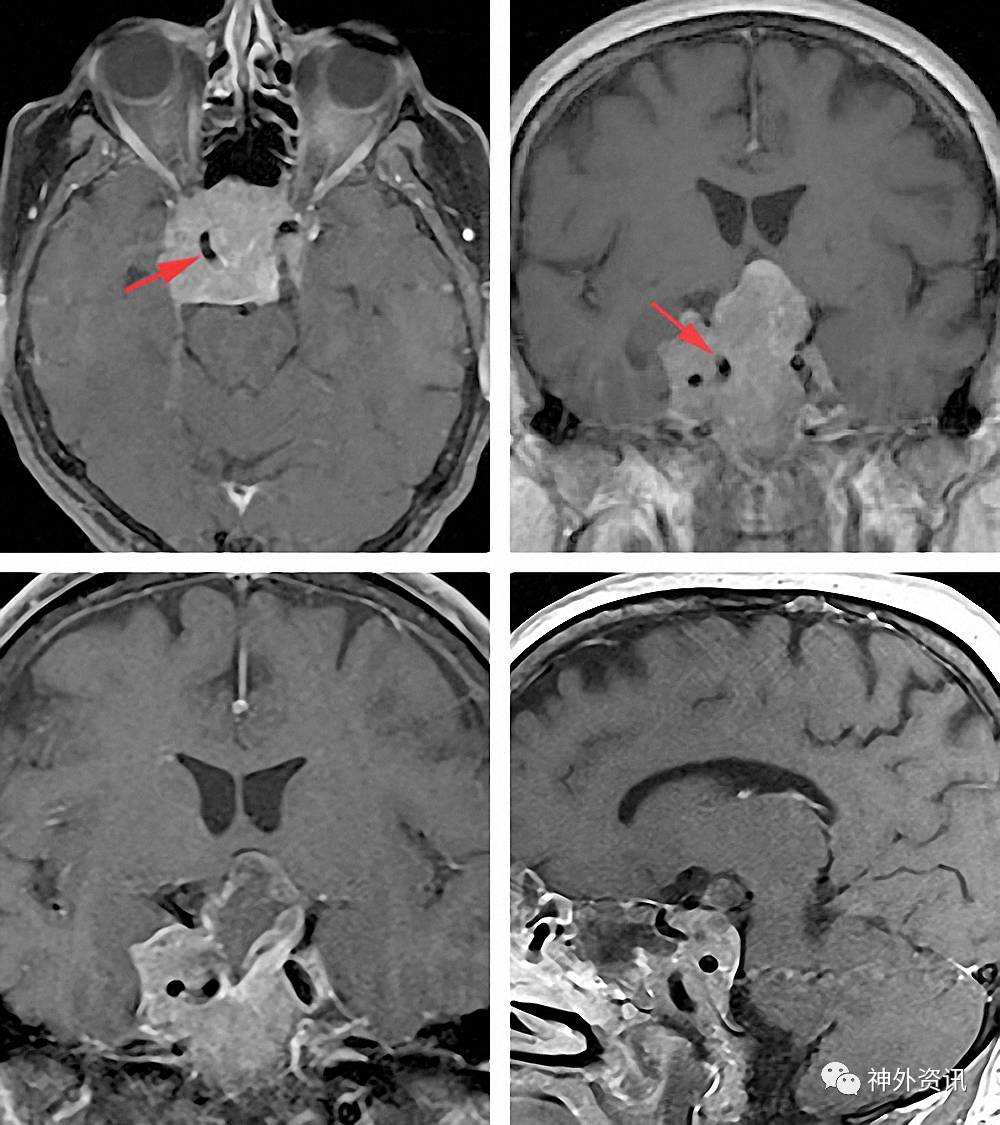 图4. 不典型的泌乳素腺瘤伴癫痫患者。病灶呈偏侧生长,影像上表现类似脑膜瘤。该病例印证了术前泌乳素水平评估对避免不必要的手术的重要性。