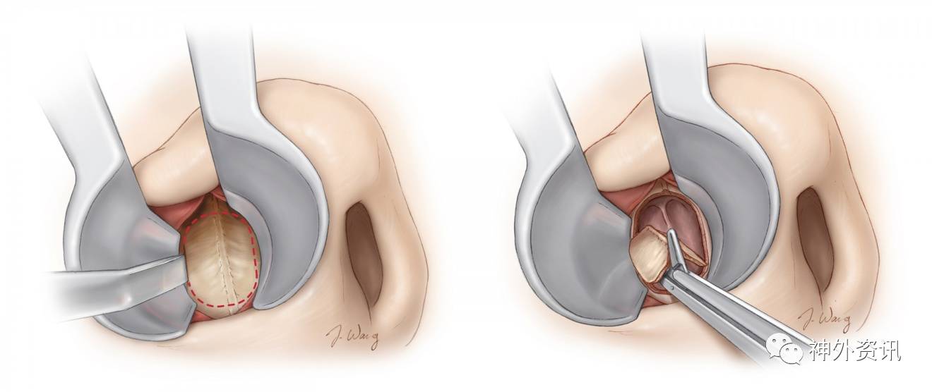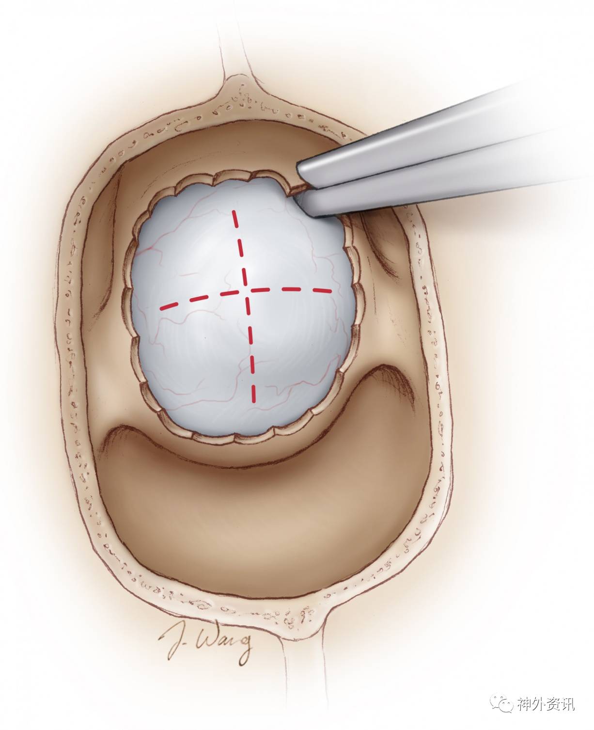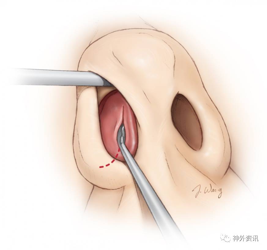 图中红虚线示硬脑膜“十”字切口,适用于切除鞍内及鞍上病变。不充分的硬膜开口可能使肿瘤切除困难,并且可能因为术者的盲点,妨碍肿瘤侧方最大程度的切除。便携的多普勒探头应该用于引导硬膜切开,如果动脉被推移到中央,硬脑膜开口应调整,否则可能损伤动脉。