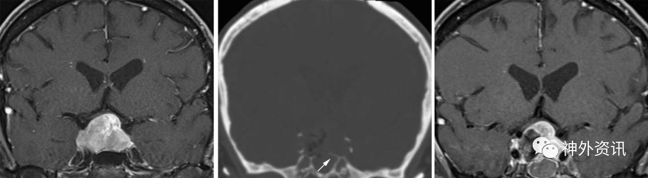 图20. 伴症状性视交叉压迫的复发垂体瘤一例(左图)。术后影像显示鞍底骨质部分移除(中图,箭头),导致肿瘤切除不全(右图)。该患者接受了再次手术,扩大鞍底骨窗,充分切除肿瘤。