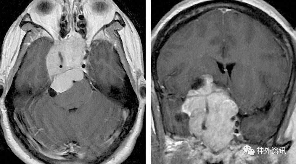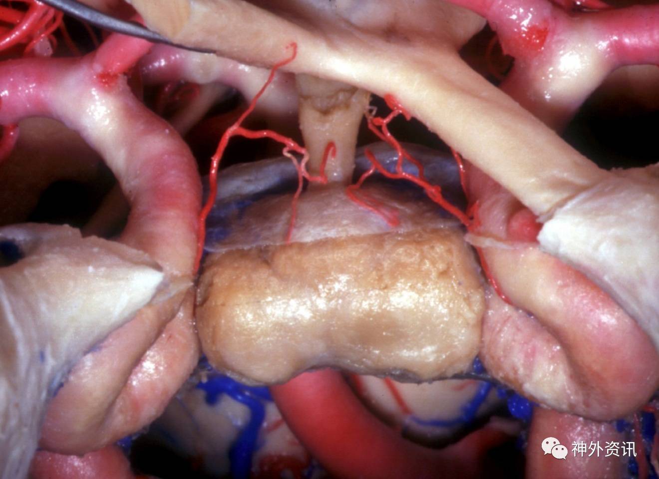 外科医师对颈动脉定位的清晰的理解很关键。该病例扩张的动脉可能被推移到中线位置而很容易在硬脑膜打开以及切除肿瘤的过程中损伤。侵袭性肿瘤可能破坏鞍区的骨性标志,严重影响术中的定位。