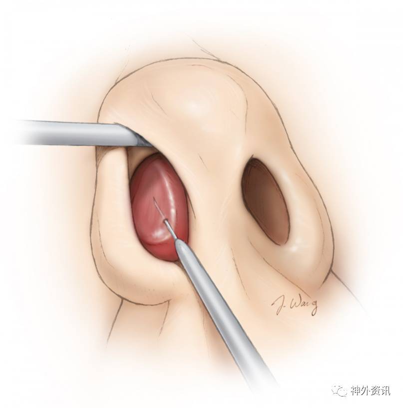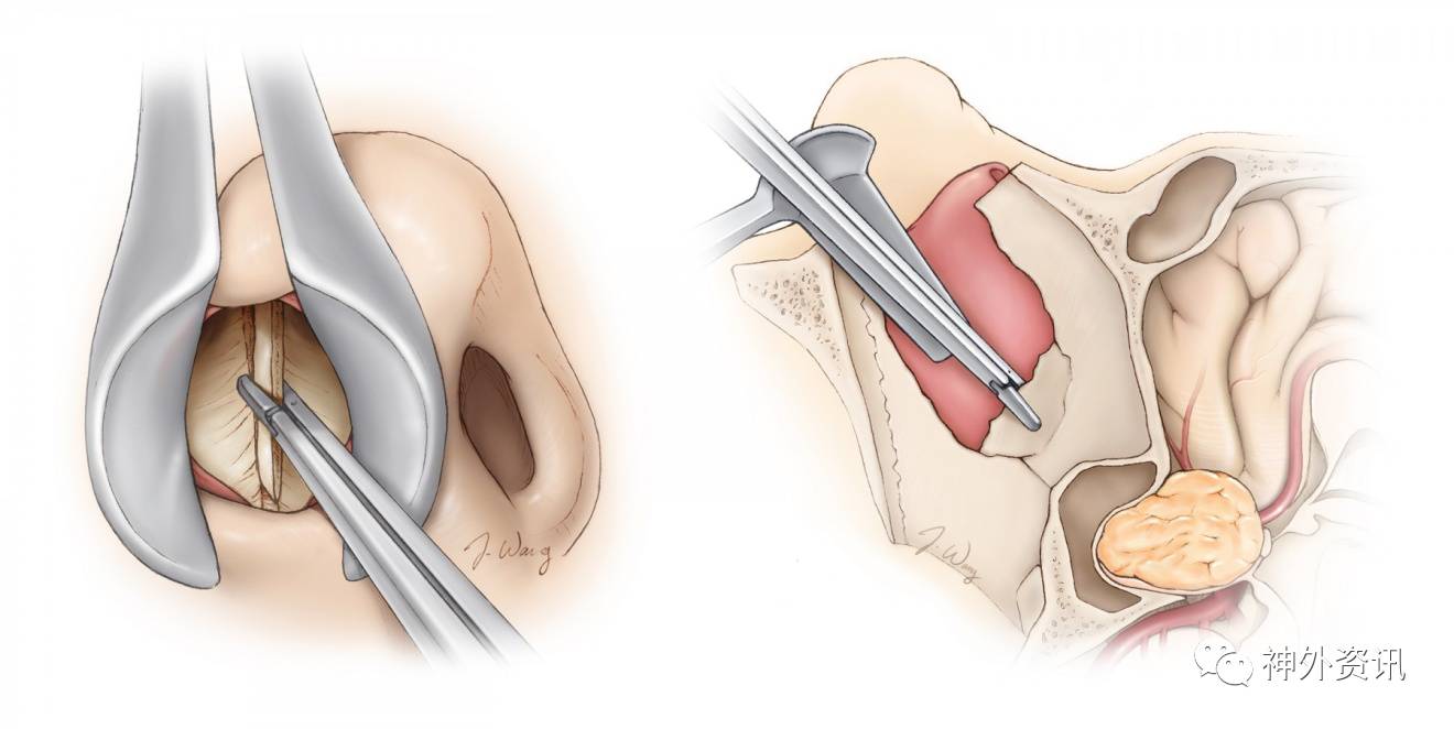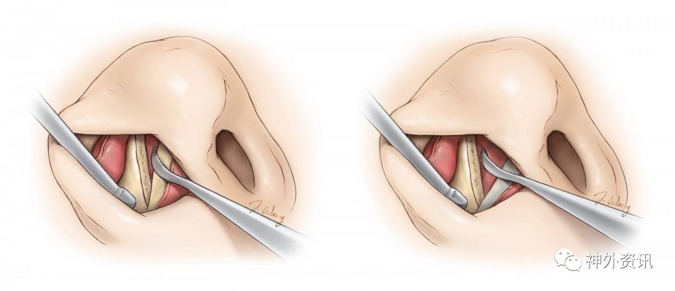需要强调,当从单侧鼻孔进入,鼻内撑开器会偏离向对侧半鞍,直接指向对应的颈动脉。术者应该认识到这点,并有意识地纠正这个自然的斜向偏差,而保持指向中线部位。