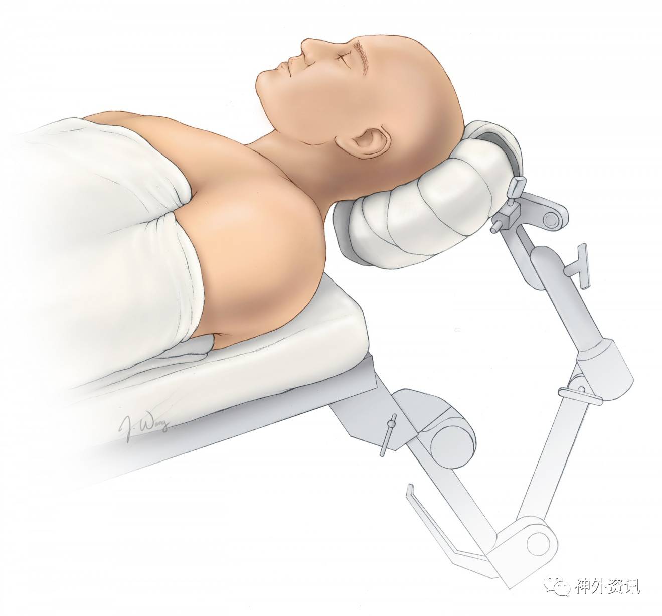 图9. 病人取仰卧,头部固定于马蹄形头圈使颈部轻微侧曲,呈“嗅探”位。运用神经导航则要求头颅由头架固定,限制术中任何轻微的头部调整。