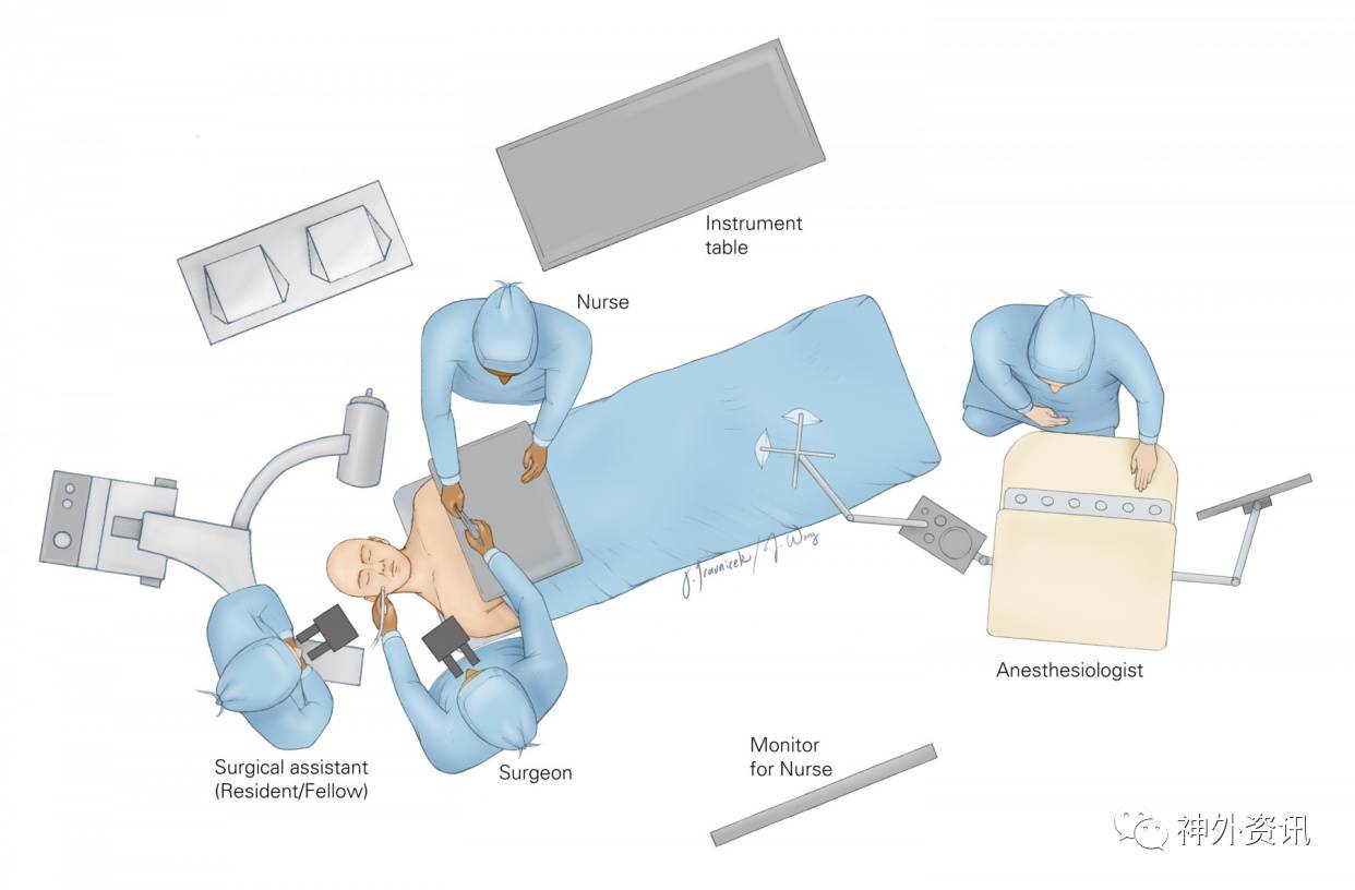 图10. 右利手外科医师从患者右侧进行手术,患者头部稍向对侧倾斜,以利于术者能够获得鞍底直视视角,且患者的肩膀不会妨碍操作。
