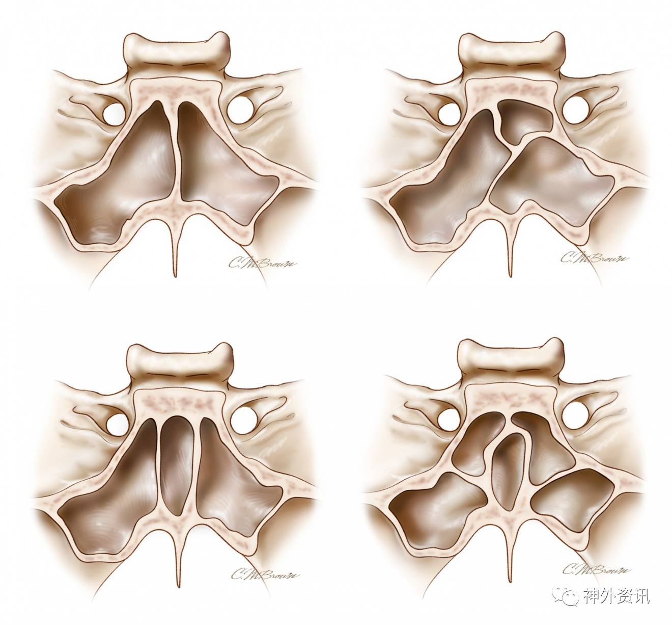 最具欺骗性的情景是窦内有两条竖直的分隔,从任一侧看都呈对称分布。移除其中一处分隔,即有可能被误认为是在“中线”上的唯一分隔,从而导致术者误判蝶鞍中央部。这个错觉可能导致外科医师打开的是颈动脉下方的蝶骨。加之鼻撑开器的偏离问题,会使定位更加复杂。定位错误,导致鞍底骨质移除不充分,肿瘤切除不佳。因此,术前必须清楚了解蝶窦分隔的解剖。