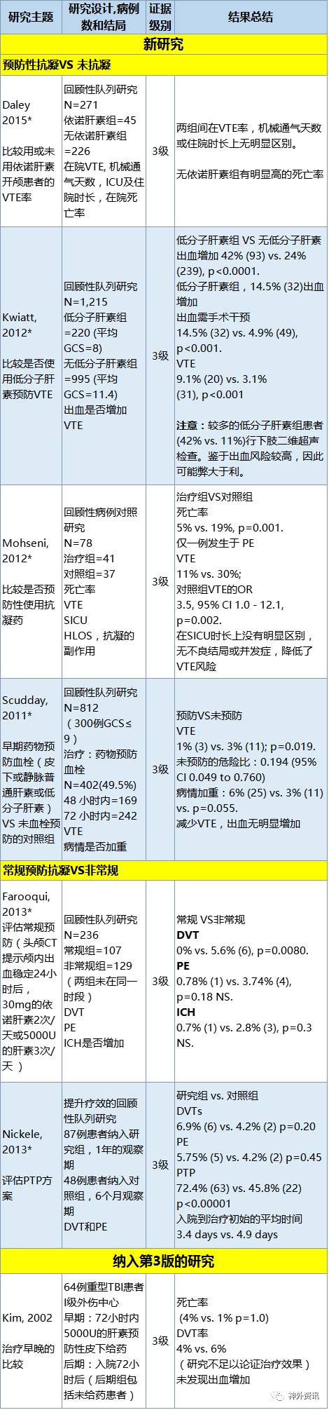 支持压力袜使用的3级推荐已整合到药物预防的推荐,因为机械性治疗如压力袜是护理的常规措施,尚无专用于TBI的证据实体。DVT药物预防是普通外伤和ICU治疗的交叉点,也是TBI的研究方向,因此TBI的有关治疗被视为推荐的焦点。因纳入标准,第3版中5项描述性、非对照研究未纳入第四版9-12。