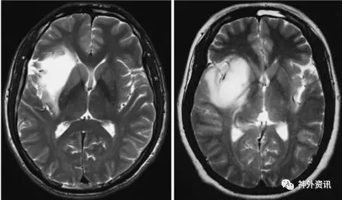 图1. 岛叶胶质瘤MRI图像:未累及壳核(左图)和累及壳核(右图)。