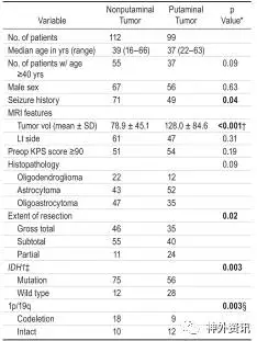 研究纳入211例原发性岛叶低级别胶质瘤患者,其中39例(46.9%)肿瘤累及壳核。累及壳核的肿瘤体积大于未累及壳核者(p<0.001),而且较少发生癫痫(p=0.04),累及壳核胶质瘤属野生型IDH1较多见(p=0.003),肿瘤全切的概率也较低(p=0.02)。单变量分析发现,术前KPS≥90分(p=0.007)、肿瘤切除程度高(p=0.008)、未累及壳核(p<0.001)和突变型IDH1(p<0.001)的患者预后明显较好(表1)。多因素分析发现,肿瘤切除程度高(p=0.035)、未累及壳核(p=0.014)和突变型IDH1(p=0.026)的患者预后更好。