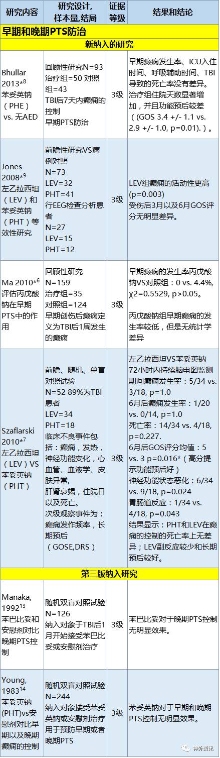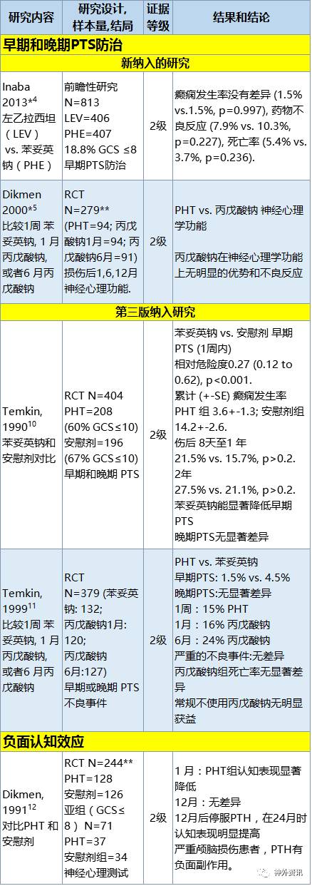 缩略词: GCS=格拉斯哥评分, LEV=左乙拉西坦, N=样本总量, PHT=苯妥英钠, PTS=创伤后癫痫, RCT=随机对照试验l, TBI=颅脑创伤.