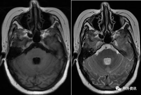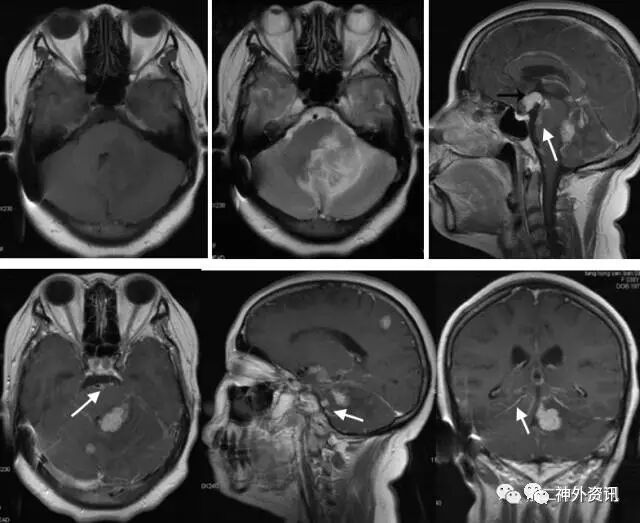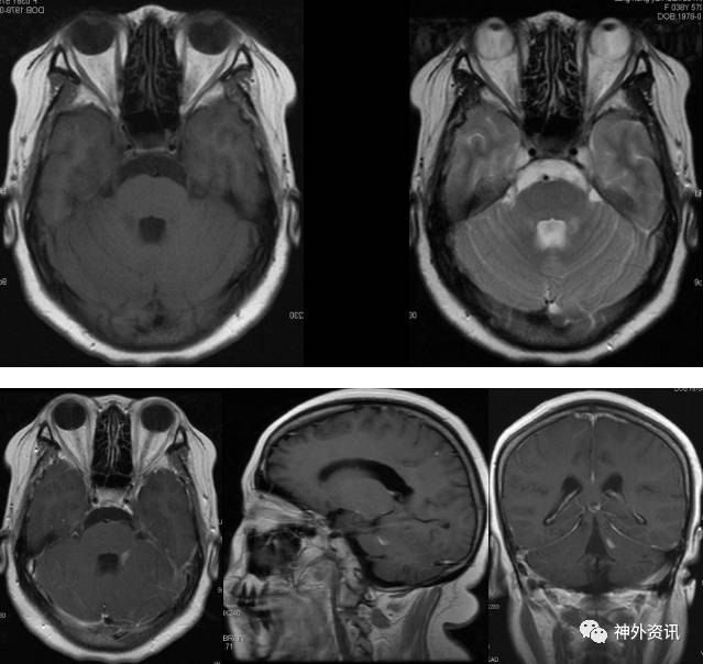 图2. MRI检查:左侧桥臂异常信号灶,范围约1.0*0.7cm,T1WI呈等信号,T2WI呈稍高信号,增强后明显强化。