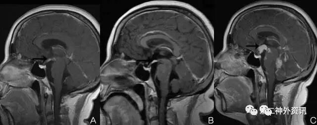 图9. MRI检查演变过程,A:首次MRI强化检查,见垂体柄漏斗部小片状强化,B:第二次检查片状强化较第一次明显,C:上述部位及整个脑干腹侧面大片软脑膜强化