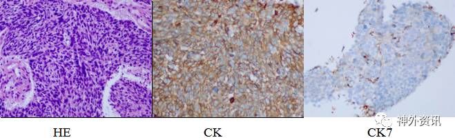 图8. 病理HE染色见中等多形性细胞呈片状高密度增殖,细胞增大,核成角-梭形,深染,胞浆嗜酸伊红,核分裂易见。免疫组化CK弥漫强阳性,CK7散在阳性。