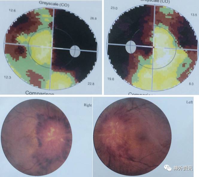 图1. 视野及眼底检查:视野不规则缺损,视乳头明显水肿。