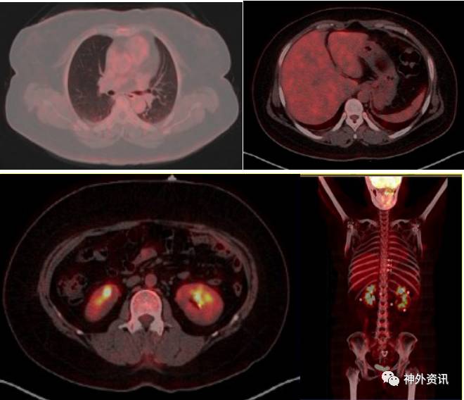 图3. PET/CT:颅内未见明显放射性摄取增高或减低灶,回盲部肠壁代谢稍高,提示炎症,左肾小结石,右侧附件区囊性病变考虑。