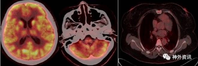 全身PET/CT显像示:①双侧额叶、顶叶、颞叶、枕叶,双侧基底节、丘脑、小脑放射性分布对称,未见明显放射性摄取增高或减低灶。②双侧胸腔少量积液;③脂肪肝;回盲部肠壁代谢稍高,提示炎症;④左肾小结石;子宫内节育环;右侧附件区囊性病变考虑(图3)。