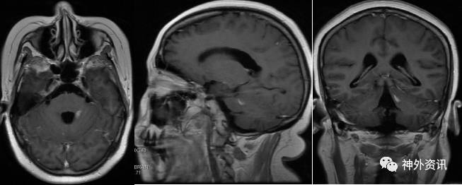 入院后神经内科予以脱水、激素及对症支持治疗,患者头痛稍缓解,视力、视野无明显改善。1月后复查头颅MRI增强,提示左侧桥臂病灶无明显变化(图5)。依然考虑左侧桥臂病灶为脱髓鞘病变可能性大。因颅内高压缓解不明显,请我科会诊后转入我科。