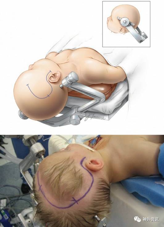 图5. 颅骨头架的放置最大程度的显露同侧大脑半球。颅骨头架通常使用在2岁或者2岁以上的儿童患者;可以配套使用导航系统。我发现神经导航系统很有用处,特别是在脑室内判断胼胝体膝部和内侧额叶纤维传导束的离断程度方面。当头部旋转70度时候,需要在身体同侧肩部下方放置凝胶垫片,放置颈部过度扭曲。手术切口采用标准的问号切口,以岛叶为中心。