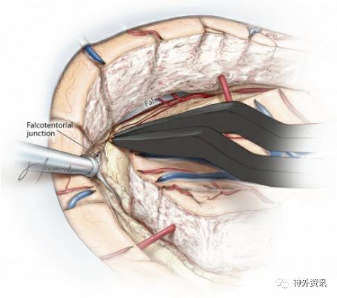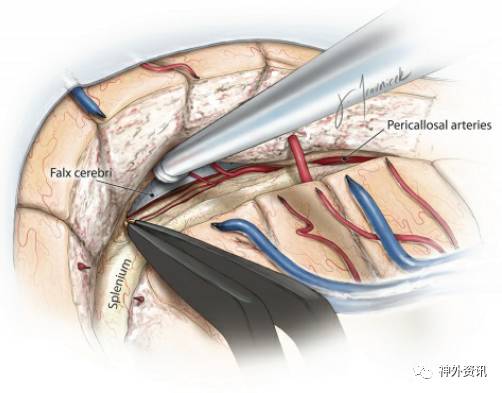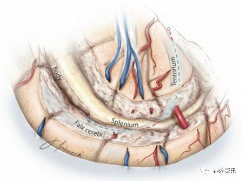 图15. 大脑镰的后缘可以帮助术者找到天幕。在切除的过程中需要谨慎的进行软膜下分离,保护大脑后动脉穿过内侧和下方蛛网膜的分支。对于侧脑室房部的分离需要在脉络丛后方进行,这样可以保护丘脑。