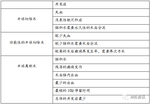 关于半球间离断术的技术改良有很多的描述,最常见的变化有环岛叶的半球离断术、改良的环岛半球离断术、平行矢状窦的半球离断术。所有的半球离断技术有四个共性:内侧颞叶结构的切除、内囊和放射冠传导纤维的阻断、经脑室的胼胝体切开术、额水平面纤维的离断。