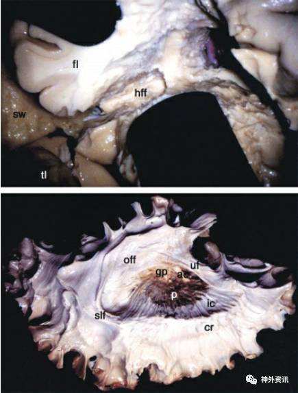 图4. 从胼胝体膝部和蝶骨嵴交界处开始行皮层下离断额叶水平纤维(上图)。纤维传导束离断后显示出额枕束和钩束(下图)。Ac=前联合,cr=放射冠,gp=苍白球,p=尾状核,sw=蝶骨嵴(图片经过Morino允许使用,Anatomical analysis of different hemispherotomy procedures based on dissection of cadaveric brains. J Neurosurg. 2002;97:423-431)。