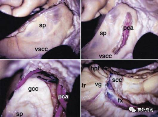 图3. 在切除颞叶和移除颞叶的内侧结构后,从颞角顶部开始在半球外侧行C形的皮质切开术。皮层切开术勾勒出了侧脑室的形状,包括侧脑室房部;侧脑室的所有结构都被打开。这种方法离断了内囊。进入侧脑室后透明隔左侧和胼胝体的腹侧面可以辨认(左上图)。胼胝体切开术沿着胼周动脉进行(右上图)。沿着胼周动脉至额叶底部,完成了对胼胝体膝部的横断手术,此处离断需要距离室间孔有数个毫米的距离(左下图)。沿着胼周动脉向后继续寻找并在海马和穹窿连接处横断胼胝体压部(右下图)。大脑镰后部可以看做是完成胼胝体离断术的可靠标志。在胼胝体压部被横断之后,在胼胝体压部的内侧面可以见到Galen静脉。Fx=大脑镰,hpt=海马尾,tr=三角区(图片经过Morino允许使用,Anatomical analysis of different hemispherotomy procedures based on dissection of cadaveric brains. J Neurosurg. 2002;97:423-431)。