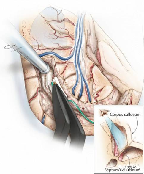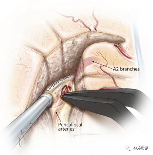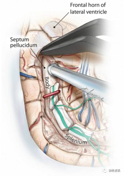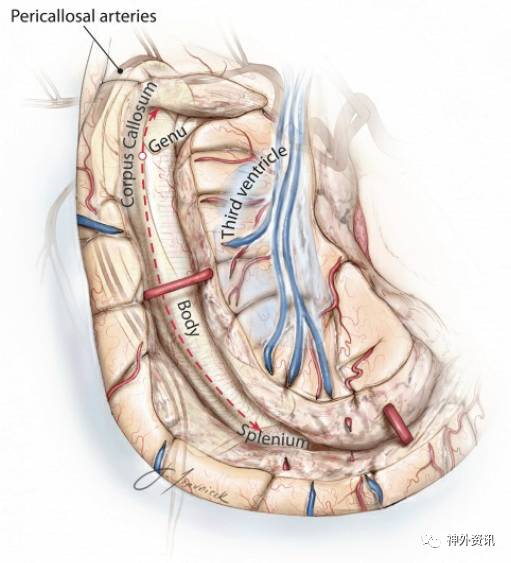 对胼胝体周围的结构的辨认可以确保手术未进入中线部位,降低了对侧大脑半球的损伤可能性。沿着确认的A2分支的近心端蛛网膜,我向前延伸至胼胝体膝部。胼胝体膝部的显著增厚、动脉标志和神经导航对于术中定位非常重要。胼胝体膝部在冠状平面处、距离室间孔后5毫米处终止,依靠这样的标志,我们可以避免损伤间脑。