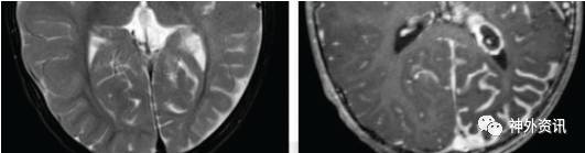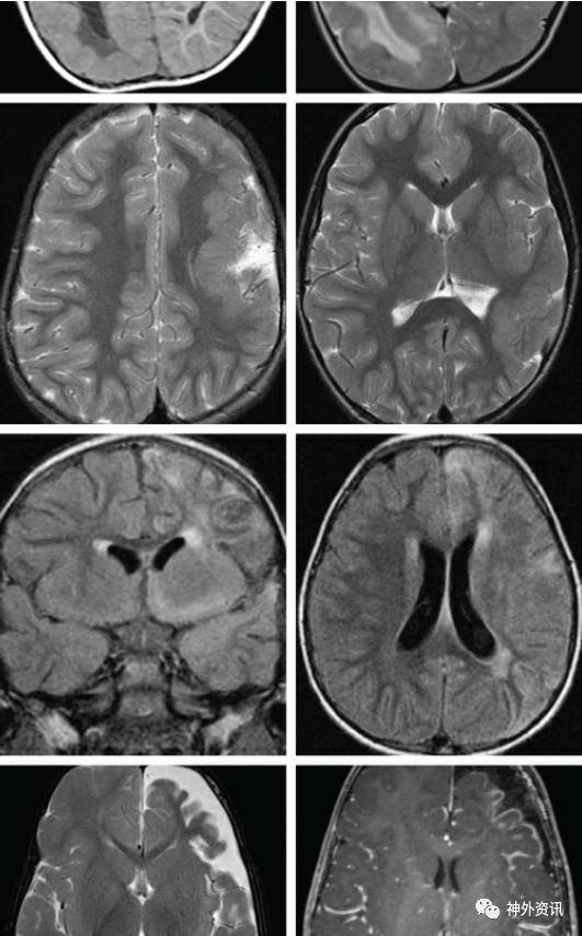 图1. 显示为右侧中等程度的半侧巨脑症。弥散性的皮层发育异常(最上图);注意脑室周围的变化;异位的灰质被发现在脑室周围;这些异常的变化在后半球尤为明显。第二排图显示:左侧外侧裂周围区的脑回增厚。第三排图显示与左侧相符合的Rasmussen’s脑炎的影像学表现,同时为手术活检证实;T2相显示异常者为脑组织的萎缩。最下图显示了Sturge-Weber综合征的影像学表现:左侧额颞叶的萎缩、枕叶软脑膜的增厚和枕极增强表现,提示血管病变。