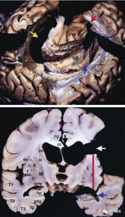 图2. 外侧观呈C形的环岛叶半球离断术(上面照片):侧脑室被彻底打开,黄色箭头指向内侧颞叶被切除的结构,蓝色箭头指向经脑室的胼胝体切开术,红色箭头指向额叶水平的纤维离断术;冠状面环岛的半球离断术(下面照片):白色箭头显示从额叶岛盖部离断内囊纤维的相关区域;黑色箭头显示的经脑室行胼胝体切开术;红线显示内囊切除术;蓝色箭头显示颞干的离断和颞叶内侧结构的离断。C=屏状核,CC=胼胝体,cg=扣带回,cn=尾状核,ec=外囊,fg=梭状回,phg=海马旁回,T1=颞上回,T2=颞中回,T3=颞下回(图片经过Morino允许使用,Anatomical analysis of different hemispherotomy procedures based on dissection of cadaveric brains. J Neurosurg. 2002;97:423-431)